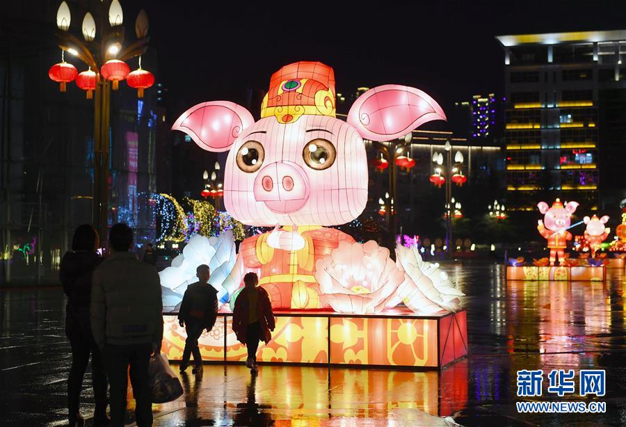 1月30日,人们在贵州省仁怀市市民休闲广场观看生肖猪彩灯。新华社发(陈勇 摄)