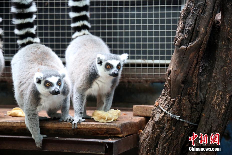 1月31日,青藏高原野生动物园内,非洲环尾狐猴、赤猴以及南美洲松鼠猴等灵长类“居民”收到饲养员为其准备的饺子与“红包”。图为非洲环尾狐猴收到水果馅的饺子。中新社记者 罗云鹏 摄