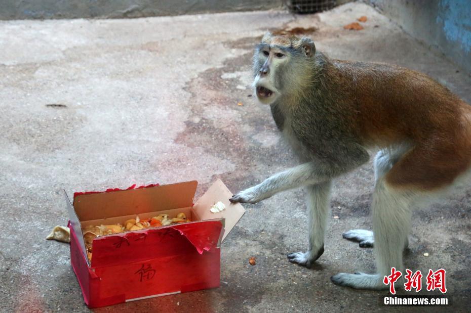1月31日,青藏高原野生动物园内,非洲环尾狐猴、赤猴以及南美洲松鼠猴等灵长类“居民”收到饲养员为其准备的饺子与“红包”。图为来自西非的赤猴打开蔬菜“红包”。中新社记者 罗云鹏 摄