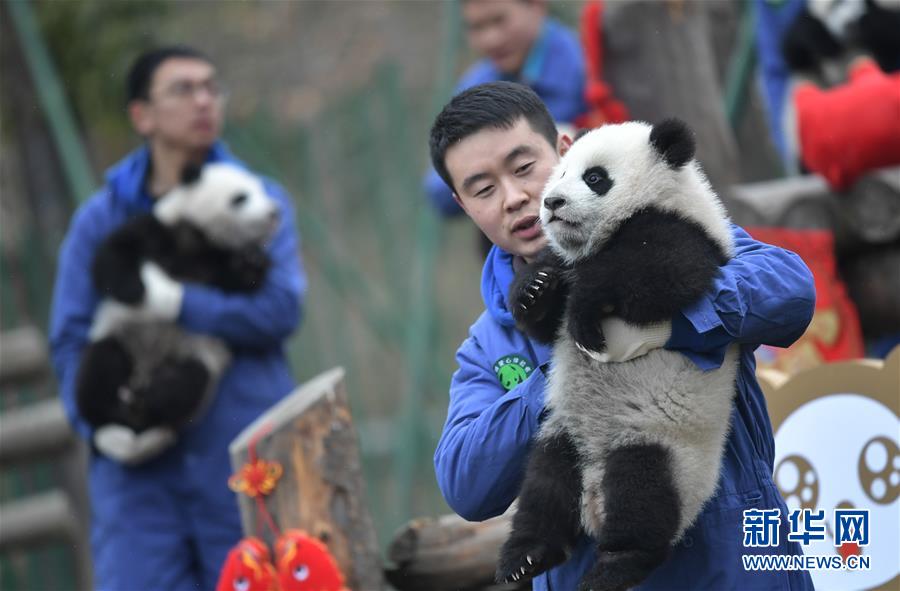 在中国大熊猫保护研究中心卧龙神树坪基地,工作人员和大熊猫宝宝合影(1月31日摄)。 新华社记者 薛玉斌 摄