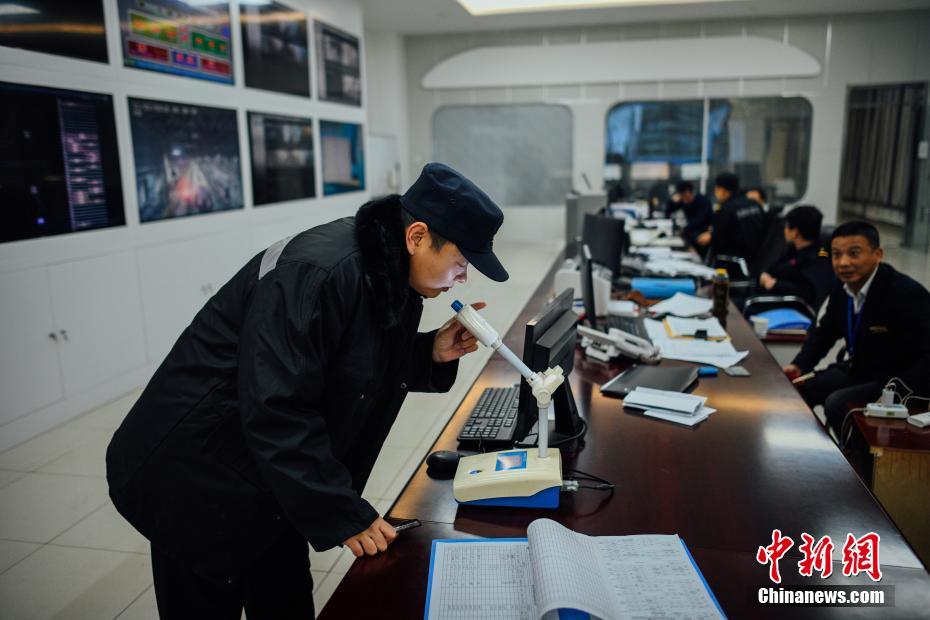 1月31日清晨,天津动车组检修站,90后动车机械师靳颖在出乘前进行酒精测试。2019年春运期间,来自京津城际车队48名随车机械师们,每天要在岗位上坚守20个小时,行走3万步,保证动车组运行安全,他们是飞驰银龙背后的高铁“医生”。中新社记者 佟郁 摄