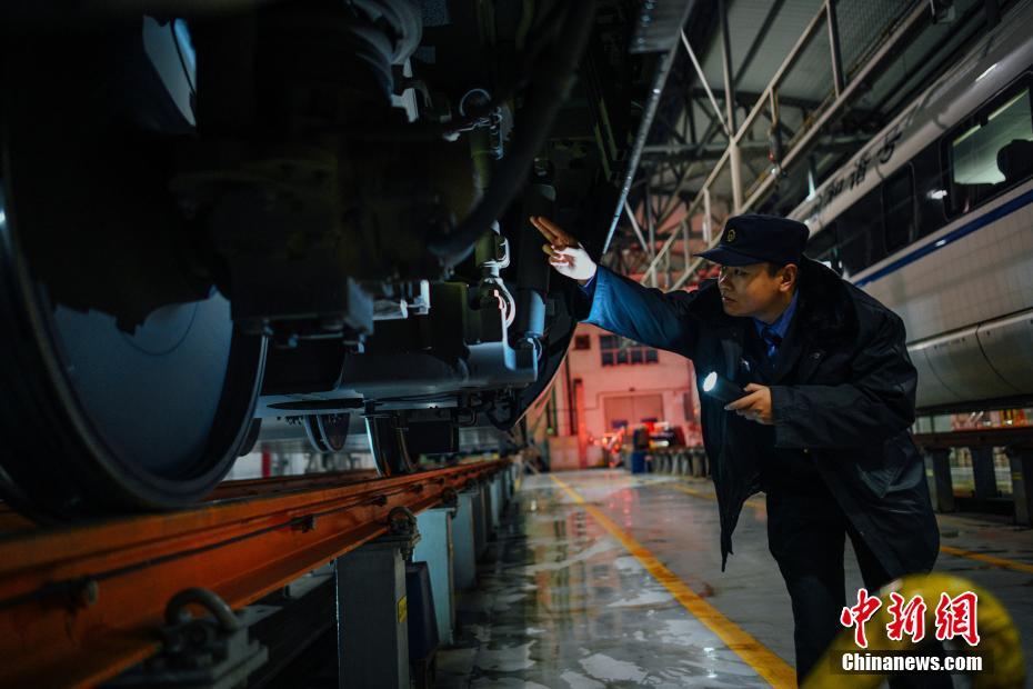 1月31日清晨,天津动车组检修站,90后动车机械师靳颖对“复兴号”高铁进行检查。2019年春运期间,来自京津城际车队48名随车机械师们,每天要在岗位上坚守20个小时,行走3万步,保证动车组运行安全,他们是飞驰银龙背后的高铁“医生”。中新社记者 佟郁 摄