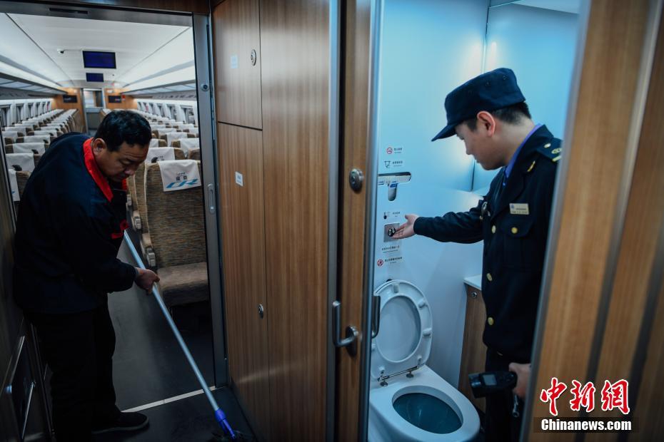 1月31日清晨,天津动车组检修站,90后动车机械师靳颖(右)对“复兴号”高铁车厢内的服务设施状态进行检查。2019年春运期间,来自京津城际车队48名随车机械师们,每天要在岗位上坚守20个小时,行走3万步,保证动车组运行安全,他们是飞驰银龙背后的高铁“医生”。中新社记者 佟郁 摄