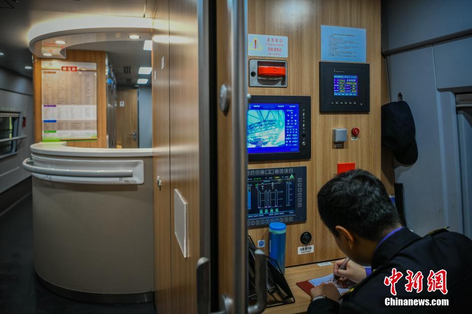 1月31日清晨,天津动车组检修站,90后动车机械师靳颖在车厢监控室记录工作日志。2019年春运期间,来自京津城际车队48名随车机械师们,每天要在岗位上坚守20个小时,行走3万步,保证动车组运行安全,他们是飞驰银龙背后的高铁“医生”。中新社记者 佟郁 摄