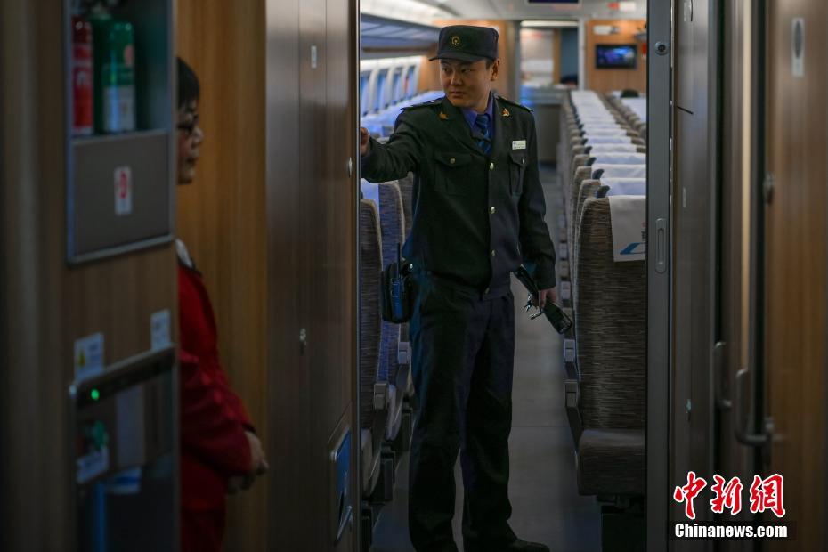 1月31日,90后动车机械师靳颖在车厢内对服务设施的状态进行检查。2019年春运期间,来自京津城际车队48名随车机械师们,每天要在岗位上坚守20个小时,行走3万步,保证动车组运行安全,他们是飞驰银龙背后的高铁“医生”。中新社记者 佟郁 摄