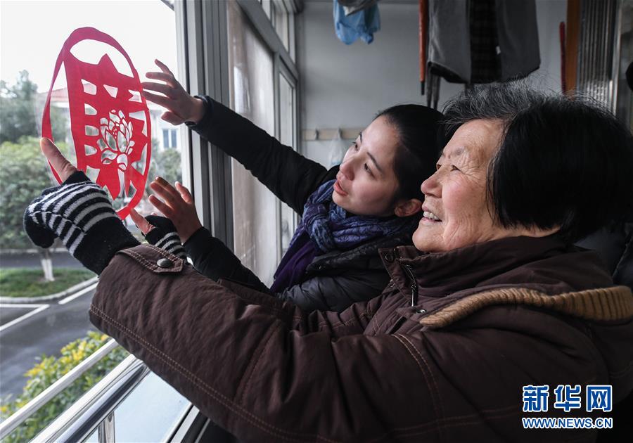 1月31日,安吉县昌硕街道天目社区居民把新春剪纸贴到家里。 新华社记者 徐昱 摄