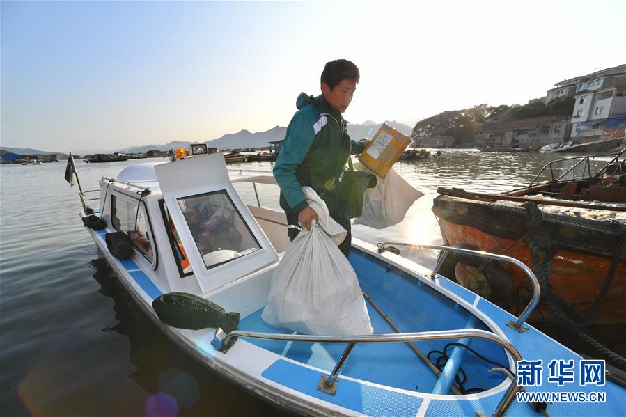 1月28日,在三都镇青山岛孟澳村码头,石进全提着邮件上岸。 新华社记者 姜克红 摄