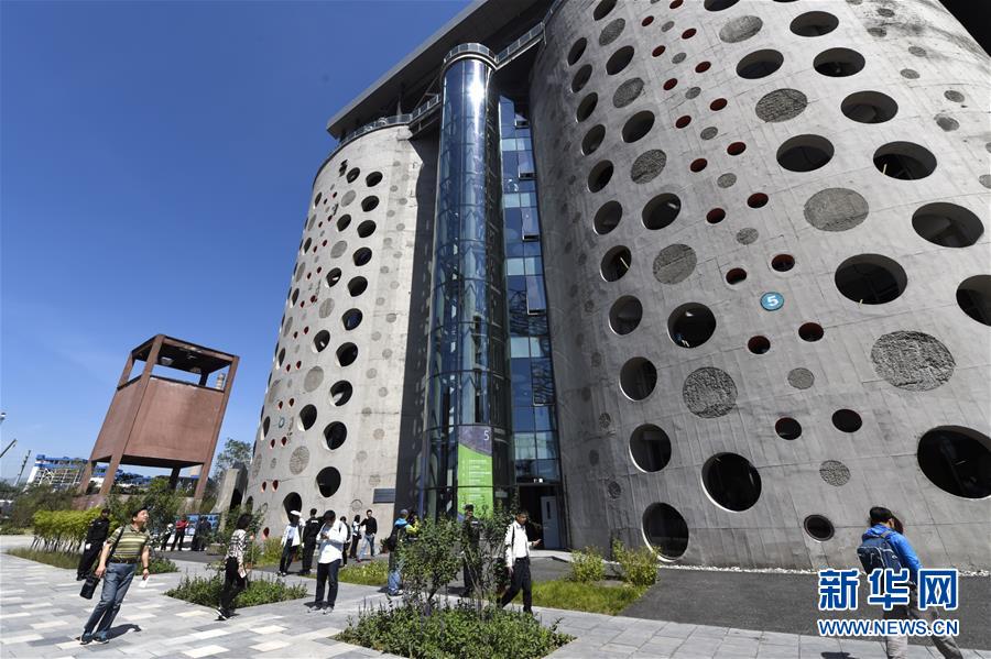 媒体记者在由存放铁矿石的筒仓改建而成的北京冬奥组委办公地点参观(2016年5月13日摄)。 新华社发