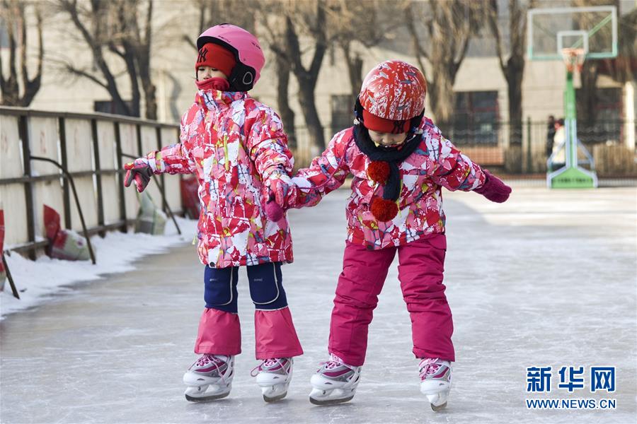 哈尔滨医科大学附属逸夫小学的两名小学生牵手滑行(2018年12月14日摄)。 新华社记者曹霁阳摄