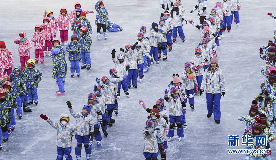 哈尔滨医科大学附属逸夫小学的学生在冰上课前做热身(2018年12月14日摄)。 新华社记者曹霁阳摄