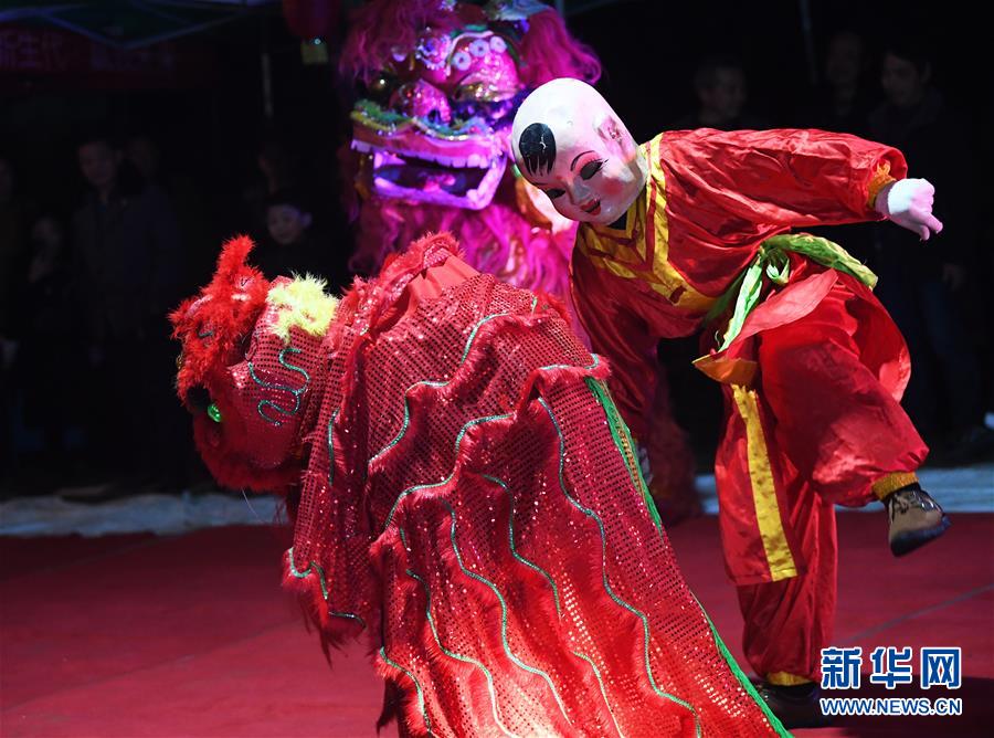1月31日,隆兴村七社村民在“农家春晚”上表演狮舞。新华社记者 王全超 摄