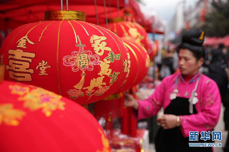 1月31日,一名苗族同胞在贵州省丹寨县县城的“年场”上选购灯笼。 新华社发(黄晓海 摄)