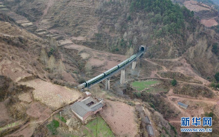 5633次列车行驶在四川省凉山彝族自治州喜德县境内(1月26日无人机拍摄)。新华社记者 薛玉斌 摄