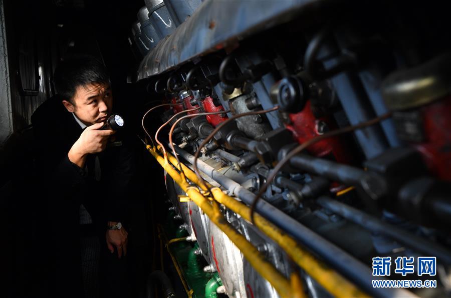1月31日,海口机辆轮渡段过海列车专调副司机孙文在发车前到机械间检查。 新华社记者 郭程 摄