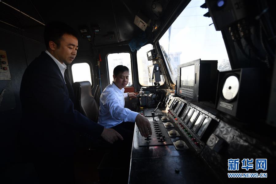1月31日,海口机辆轮渡段过海列车专调司机李衡斌(右)和副司机孙文在牵引火车内工作。 新华社记者 郭程 摄