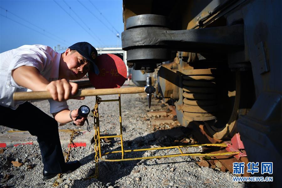 1月31日,海口机辆轮渡段过海列车专调司机李衡斌在出乘前检测火车外部件。 新华社记者 郭程 摄
