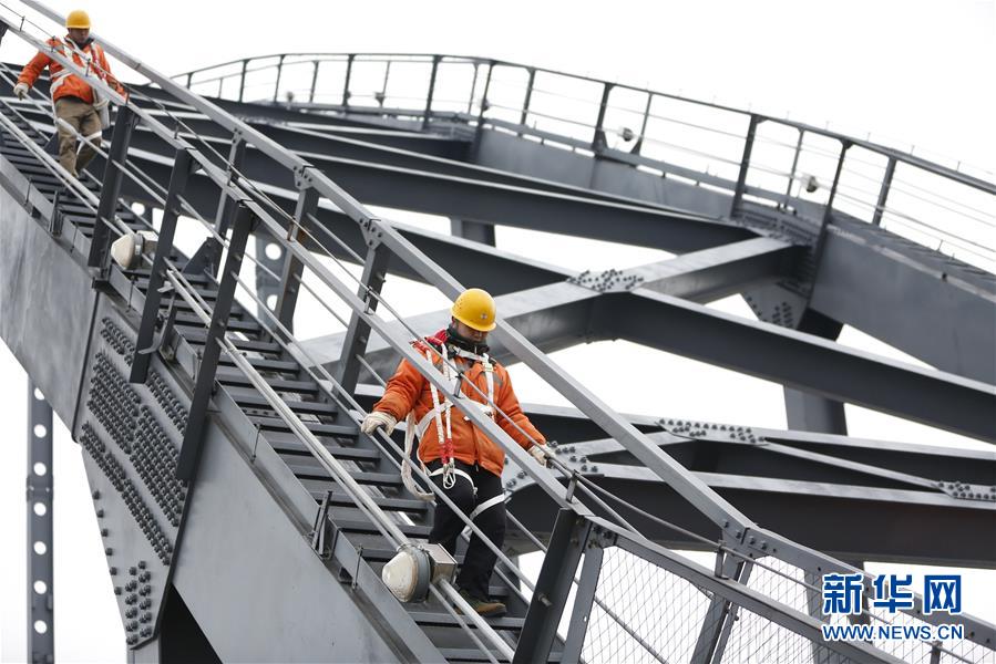 1月31日,在九江长江大桥上,桥梁工准备前往下一个作业点。 新华社发(丁波 摄)