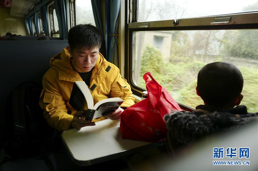 1月31日,一名乘客在5612次绿皮“小慢车”上看书。 新华社记者 刘潺 摄