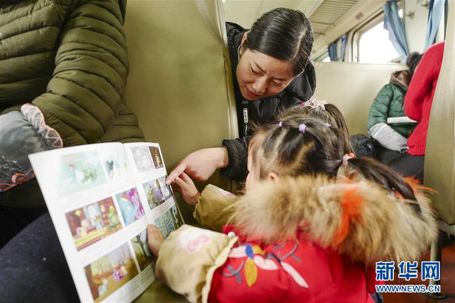 1月31日,在5612次绿皮“小慢车”上,一位母亲给小女孩讲故事书。 新华社记者 刘潺 摄