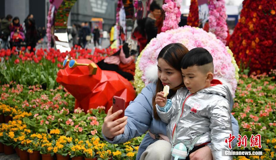 2月1日,春节前夕,鲜花、大红灯笼等扮靓成都街头。图为带孩子的市民在花坛前拍照。中新社记者 刘忠俊 摄