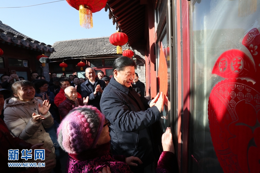 中华民族传统节日农历春节来临之际,中共中央总书记、国家主席、中央军委主席习近平在北京看望慰问基层干部群众,向全国各族人民致以美好的新春祝福。这是2月1日上午,习近平来到北京前门东区,走进居民家中看望慰问,同群众一起贴窗花。 新华社记者 鞠鹏 摄