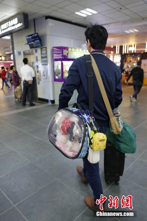 2月1日,台北车站内,乘客带着宠物准备乘高铁返乡。当天是台湾9天春节假期前的最后一个工作日,台北车站等重要交通枢纽迎来客流高峰。中新社记者 陈小愿 摄
