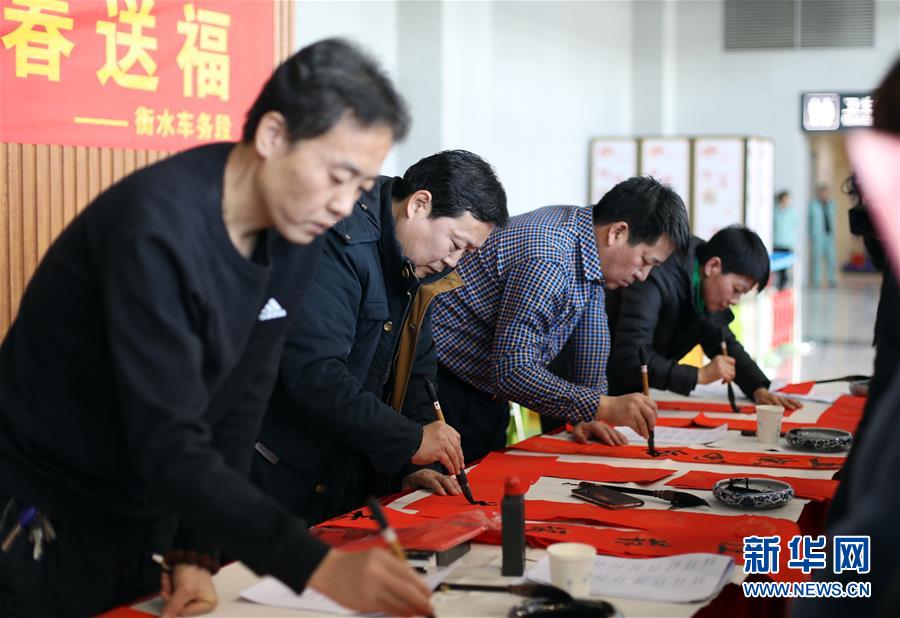 2月1日,书法爱好者在衡水北站为旅客书写春联。 当日,中国铁路北京局集团有限公司衡水车务段在衡水北站开展“温馨春运 新春送福”活动,组织书法爱好者书写春联、“福”字,让旅客带“福”回家。 新华社记者 朱旭东 摄