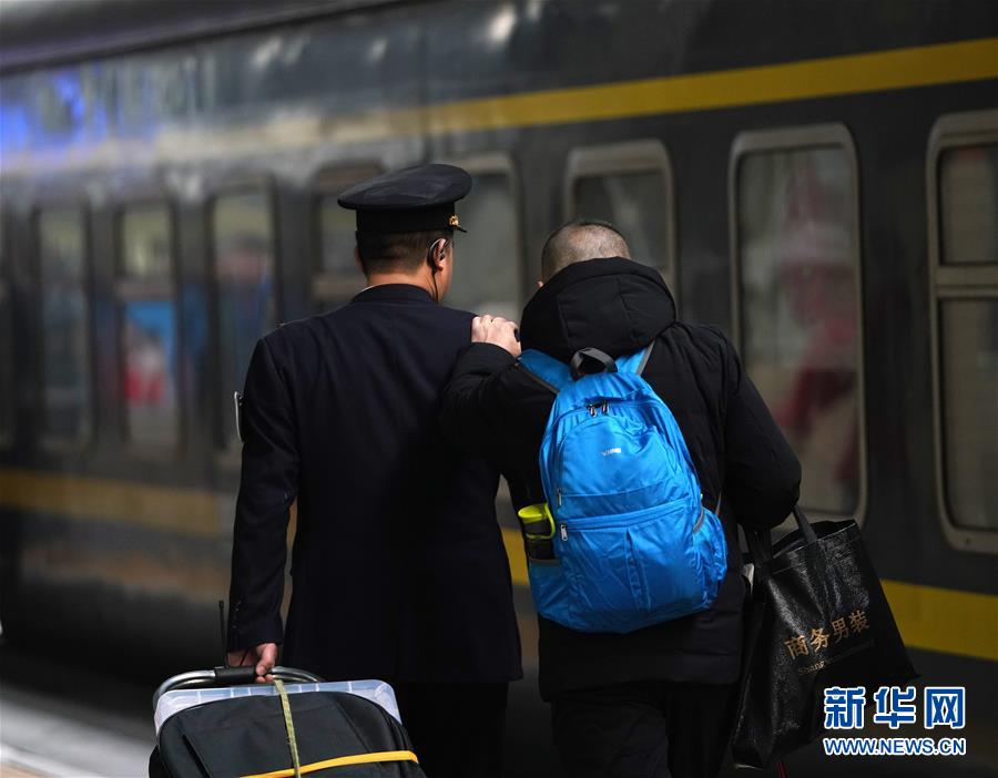 1月29日,在北京火车站,李长明(左)领着视障人士孙洪江去车厢。新华社记者 鞠焕宗 摄