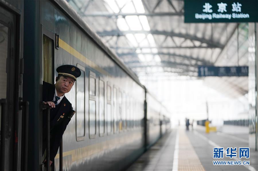 1月29日,在北京火车站,K1023次列车载满旅客即将离开北京,李长明在车厢门口查看旅客上车情况。新华社记者 鞠焕宗 摄
