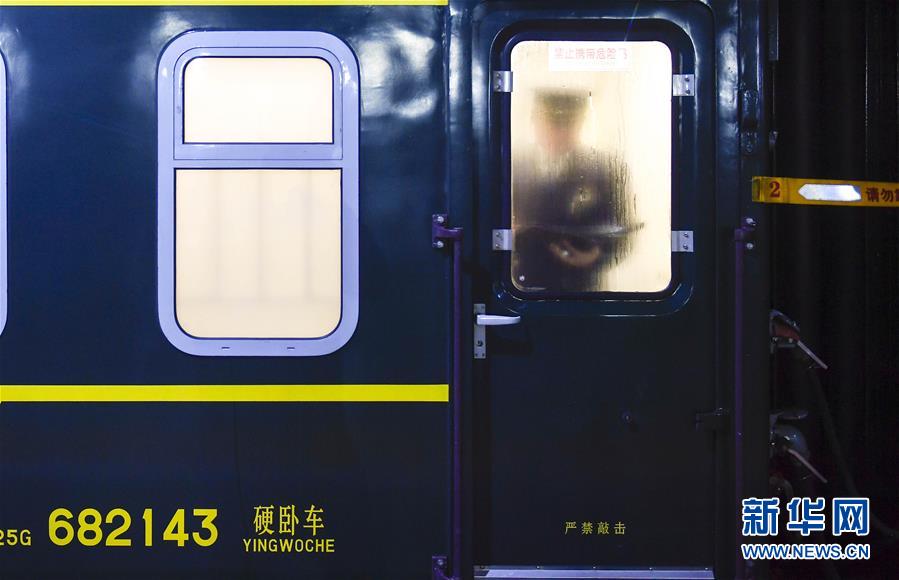 1月29日,在K1023次列车停靠的山海关站,李长明在车厢内查看旅客换票信息。新华社记者 许畅 摄