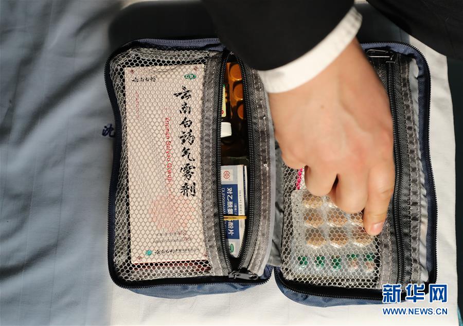 根据多年经验,李长明会针对列车上常出现的突发疾病为旅客准备药品。这是在K1024次列车上,李长明整理自己为旅客准备的药品急救包(1月29日摄)。 新华社记者 杨青 摄