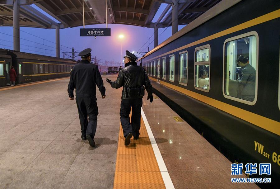 在乌鲁木齐站,周小平(右)和同事在Z42次列车开动前做最后的检查工作(1月26日摄)。 新华社记者 王菲摄