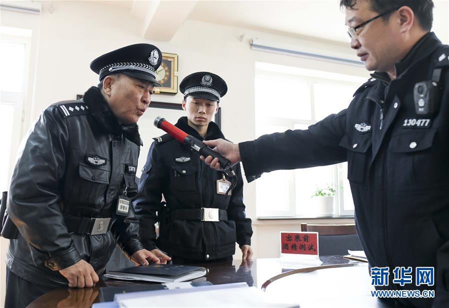 在乌鲁木齐铁路公安局乌鲁木齐公安处乘警支队,周小平(左)在出乘前做酒精测试(1月26日摄)。新华社记者 王菲摄