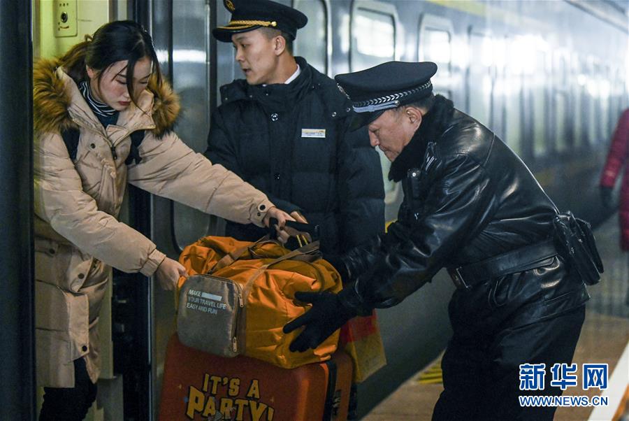 周小平(右)在乌鲁木齐站帮助旅客搬运行李(1月30日摄)。 新华社记者 王菲摄