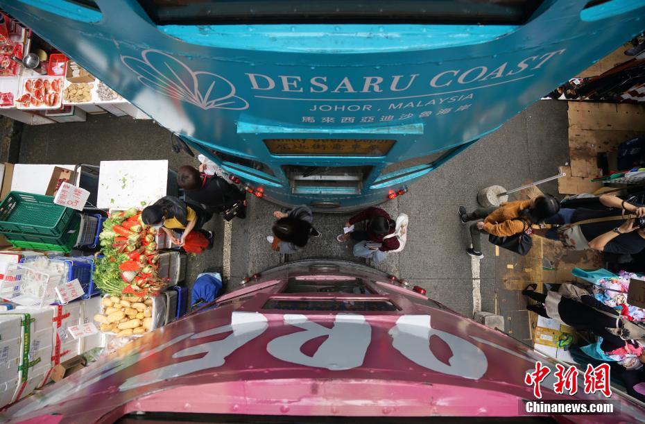 2月3日是农历十二月二十九日,位于香港北角的春秧街露天街市人口攒动。各种年货琳琅满目,众多市民前来购买年货。图为行人在两辆叮叮车之间狭小的空隙间穿行。中新社记者 张炜 摄