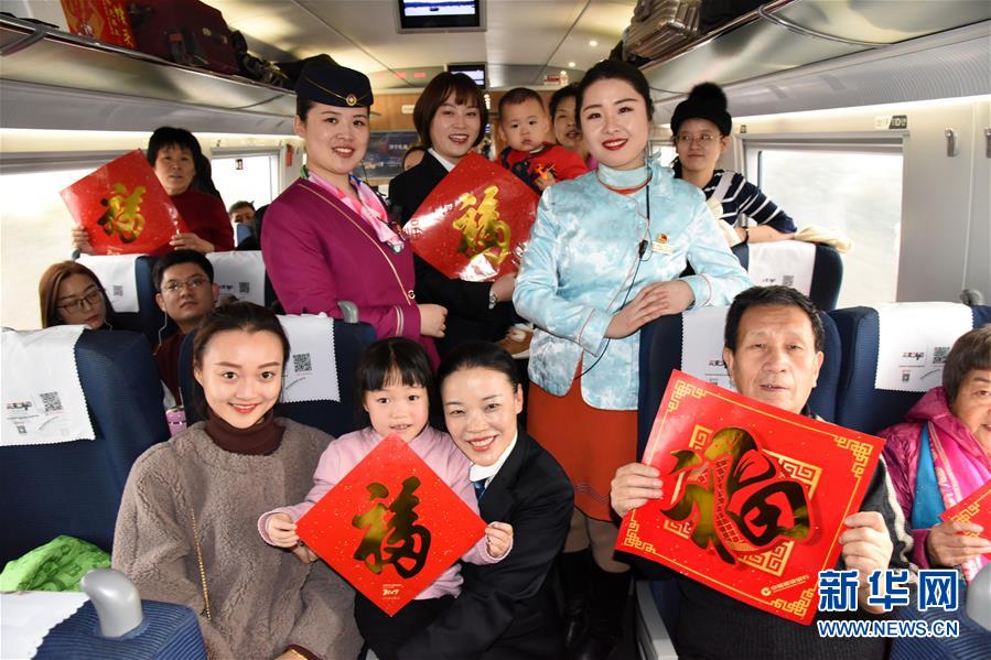 2月3日,G184次列车的工作人员和旅客一起合影留念。 春节来临之际,由青岛始发的部分列车开展了新春送“福”系列活动,在车厢内营造喜庆祥和氛围的同时,也为奔忙返乡的乘客送上旅途的祝福。 新华社记者 李紫恒 摄