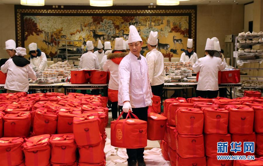 2月3日,苏州一家老字号餐馆服务员搬运刚包装好的“打包年夜饭”套餐。 新华社发(王建康 摄)