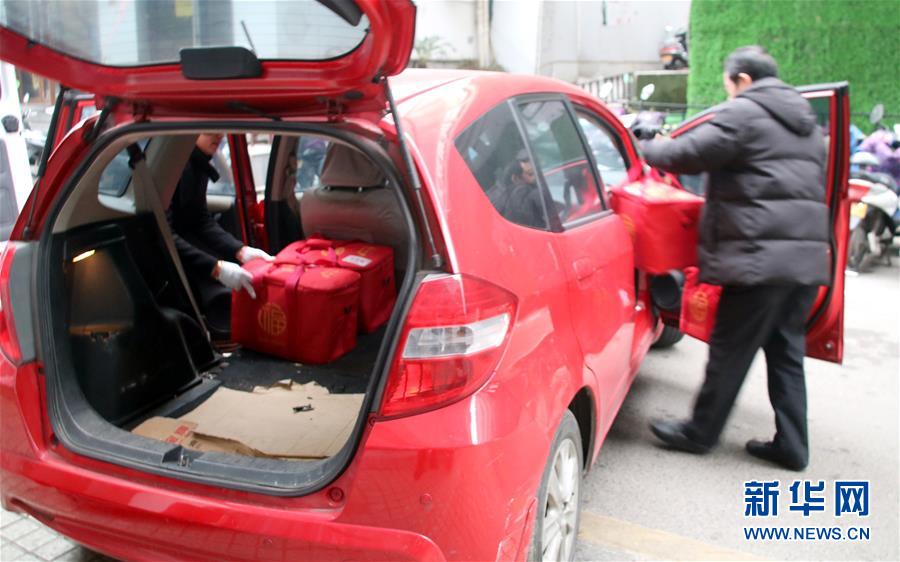 2月3日,市民将在苏州一家老字号餐馆预订的“打包年夜饭”套餐装运回家。 新华社发(王建康 摄)