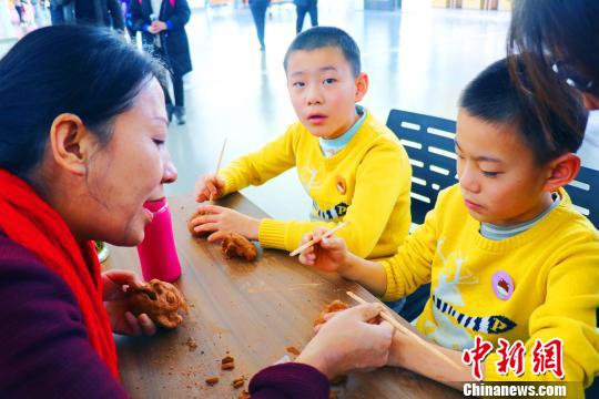 乘客与非遗传承人共同制作泥塑。银川机场供图