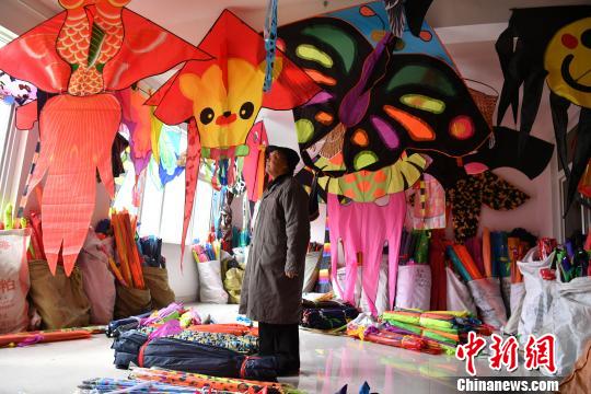 图为77岁的杨际澄老人和他的风筝,老人从16岁就开始制作风筝,如今每年要做出大约10万只风筝。 张浪 摄