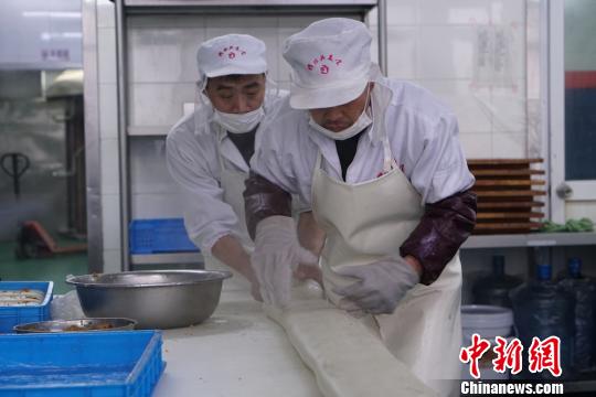 年糕初步成型,进入最重要的揉糕阶段。很多人喜欢吃年糕,不仅是因为年糕香气扑鼻,更重要的是喜欢它那软软糯糯的口感,而这主要是通过“揉”来实现的。 孙权 摄