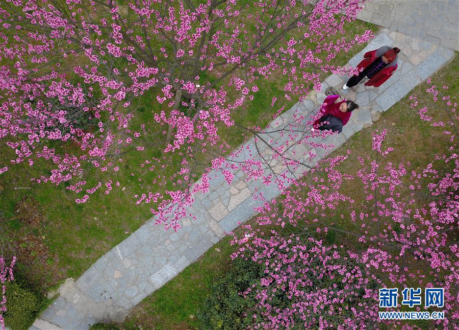 2月3日,在贵州省凯里市,市民从梅花旁走过(无人机拍摄)。 新华社发(蔡兴文 摄)