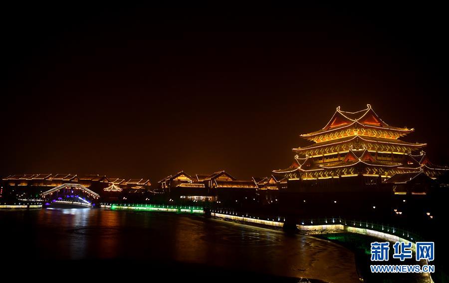 河南开封大宋御河的夜景(1月14日摄)。 新华社记者 李嘉南 摄
