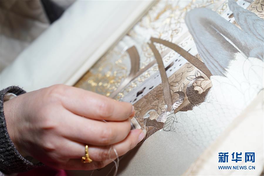 一名民间手工艺人在河南开封文化客厅内展示汴绣技艺(1月15日摄)。 新华社记者 卢烨 摄