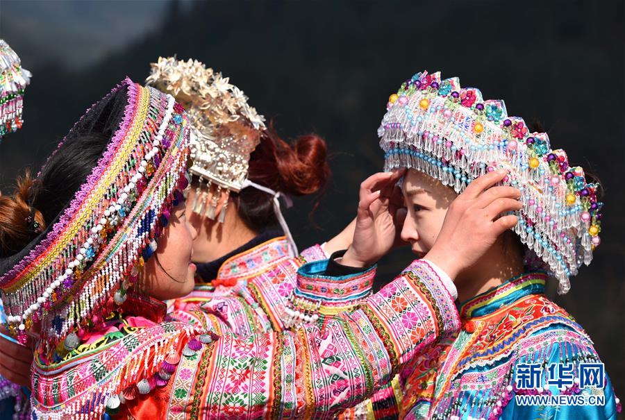 四川省叙永县后山镇三斗米村苗族妇女为游客(右)整理服饰(1月16日摄)。新华社记者 陈天湖 摄