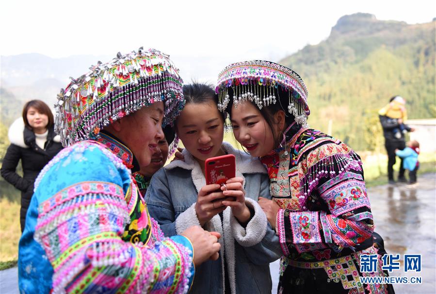 四川省叙永县后山镇三斗米村妇女在查看手机(1月16日摄)。新华社记者 谢佼 摄