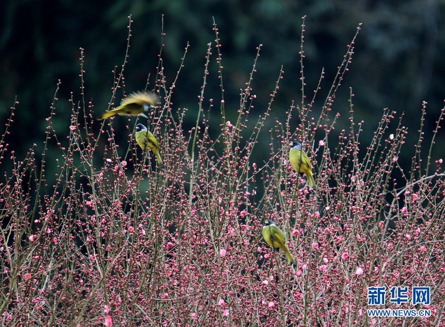 2月2日,安徽休宁金佛山生态公园内,小鸟飞落在梅花绽放的枝头上“闹”春“戏”花。新华网发(施广德 摄)