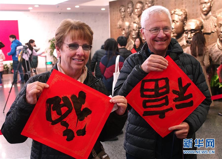 2月4日,来自美国的游客菲舍尔夫妇在中共一大会址纪念馆大厅展示刚领到的“福”字。 新华社记者 任珑 摄