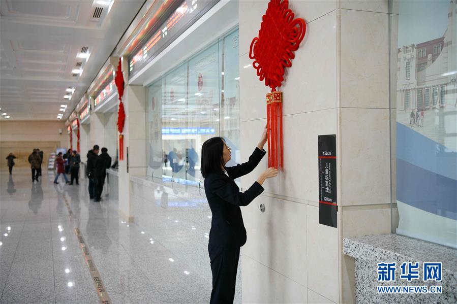 哈尔滨火车站工作人员在售票厅整理春节挂饰(1月29日摄)。新华社记者 王松 摄