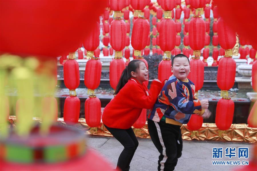2月4日,在江苏省盱眙县,两名孩子在挂满灯笼的广场玩耍。 当日是除夕,各地张灯结彩,喜气洋洋。 新华社发(周海军 摄)